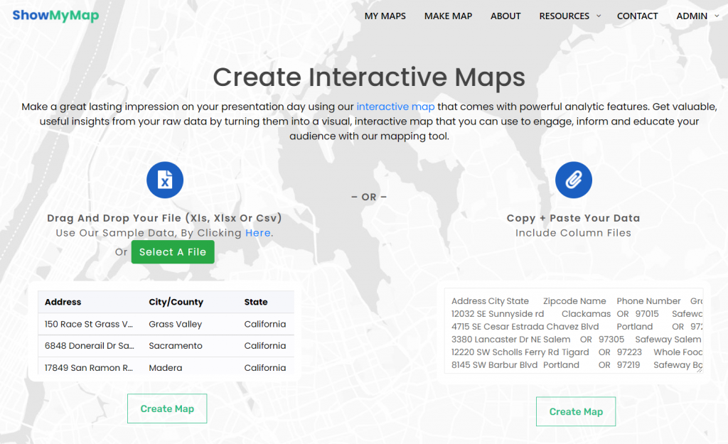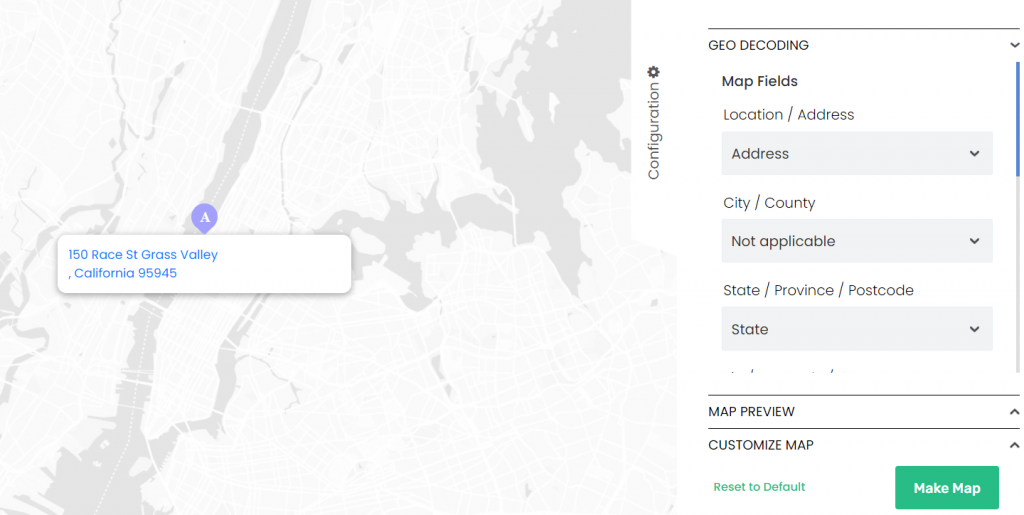 - Click on “Create Map.” You will then be routed to the configuration where you geo decode and customize your map depending on your specification and needs.