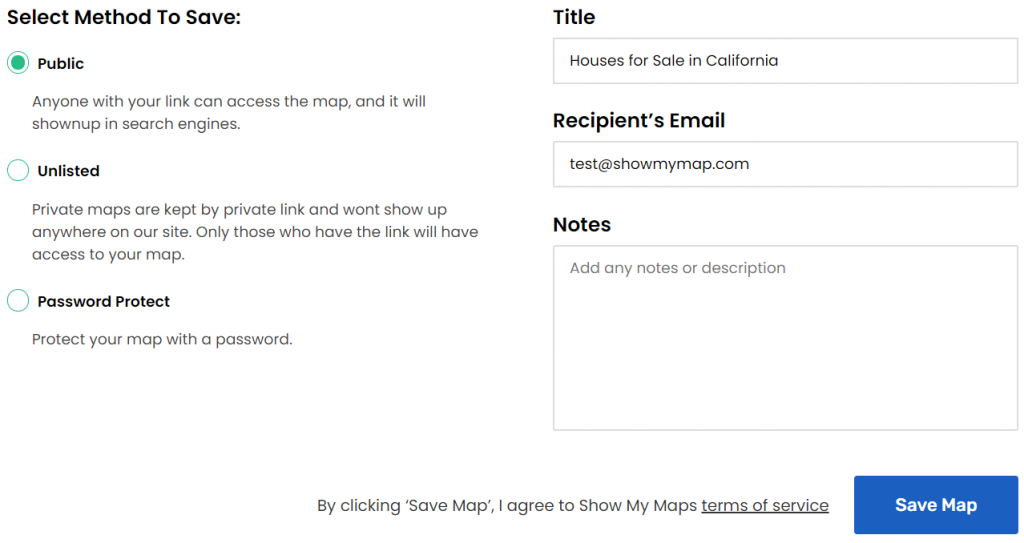 - The last step would be to add a title and the email address where you want to receive the unique link of your map and the short code should you want to embed the map on other websites. You can also add some notes and select the method of saving, whether its Public, Unlisted or Password Protected. Click on “Save Map”.